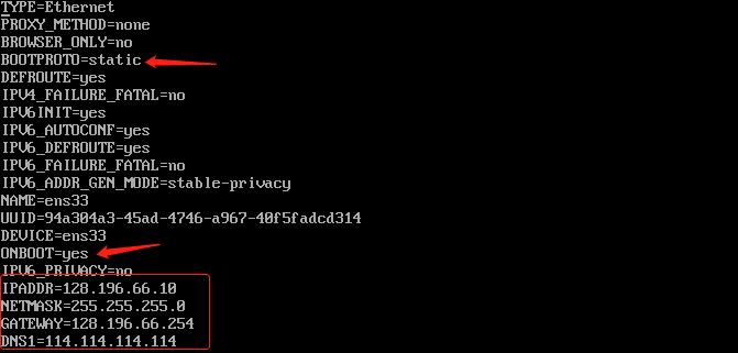 vi ifcfg-ens33 # 由于是最小化安装的系统,没有 vim 命令 - 进入配置文件中,修改默认的网络分配方式 dhcp -> static,且开启 onboot,添加静态IP信息。
