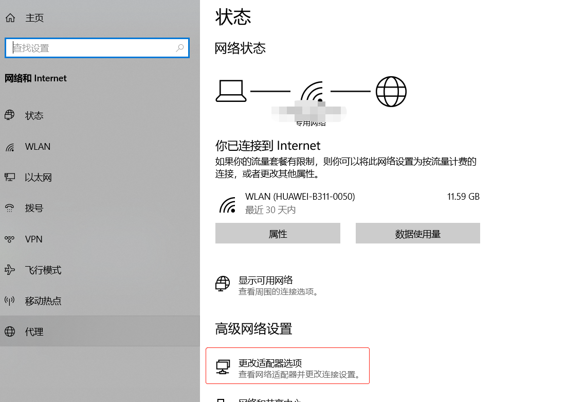 - 进入设置页面后,在 高级网络设置 中,点击 更改适配器项。