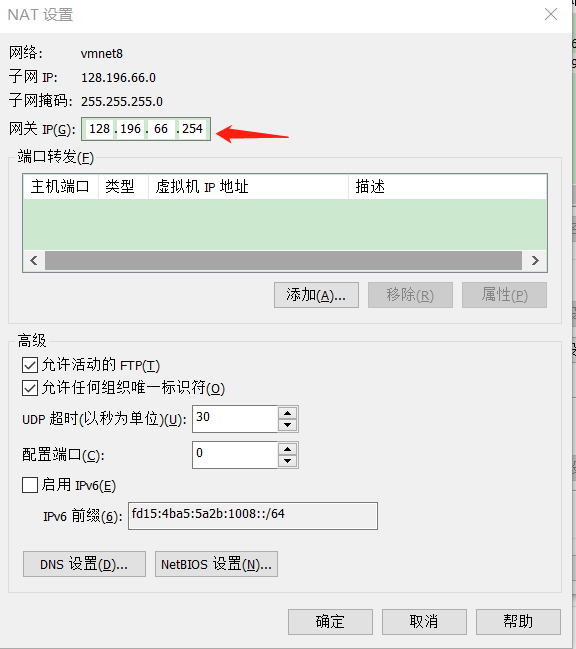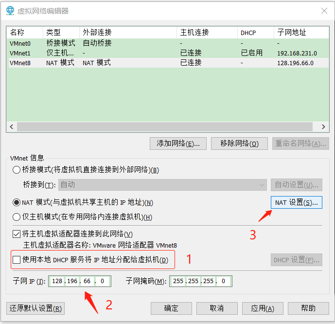 - 依旧选择 VMnet8,修改默认配置项,取消DHCP,修改子网IP,然后进入NAT设置界面
