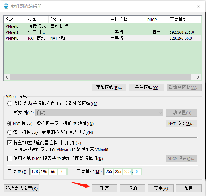 - 修改 VMware Network Adapter VMnet8 网卡的本地静态IP,方便测试网络