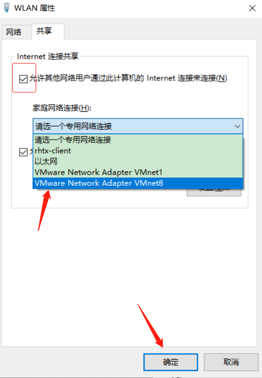 - 勾选允许其他网络用户通过此计算机的 Internet 连接来连接,然后在家庭网络连接列表中选择VMware Network Adapter VMnet8。最后点击